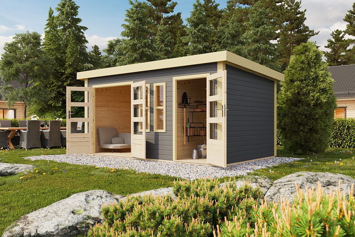 La cabane de jardin "Schöbuch 2" est une cabane divisée en deux pièces séparées et fait partie de la collection Woodfeeling de la marque Karibu. Ce modèle est peint en couleur gris terre. Ces deux pièces séparées permettent un grand nombre de mise en place possible.